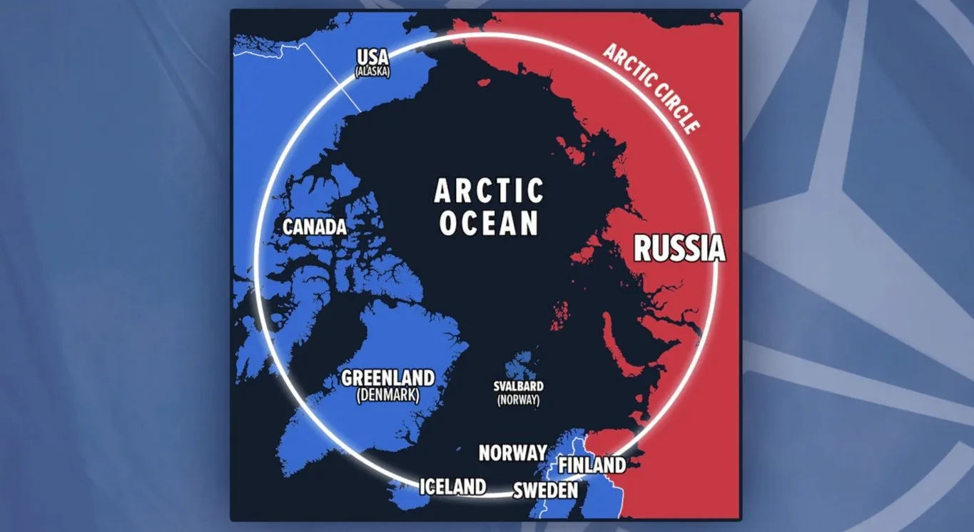 Графика, която показва Арктическия регион, включващ Канада, САЩ, Гренландия/Дания, Исландия, Норвегия, Швеция, Финландия и Русия. (BNN Bloomberg)