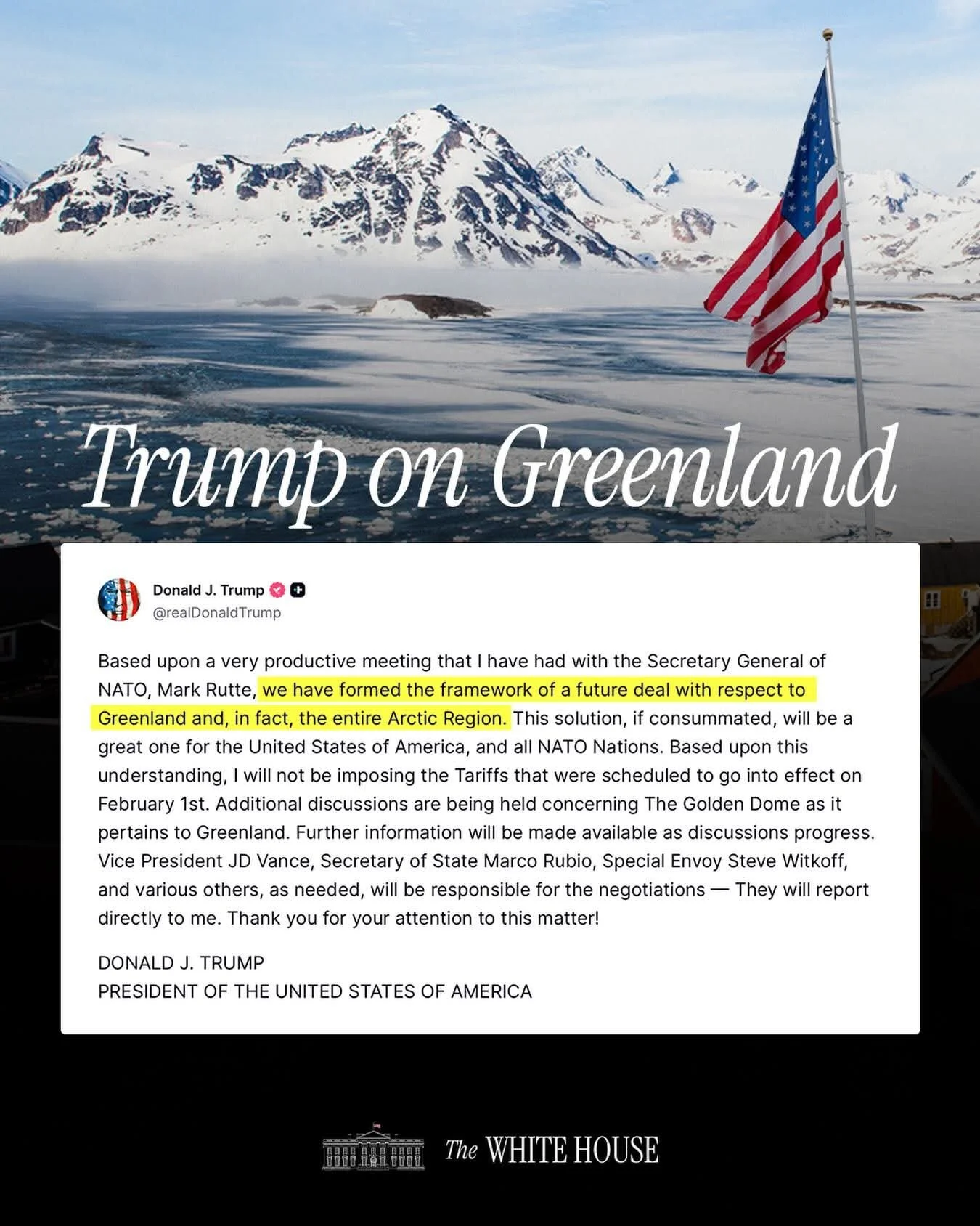 По думите на Тръмп това става след „много продуктивна среща“ с генералния секретар на НАТО Марк Рюте. Доналд Тръмп заяви че, вече са оформили рамката на бъдещото споразумение, което при финализиране, би имало стратегическо значение както за САЩ, така и за всички държави членки на НАТО.