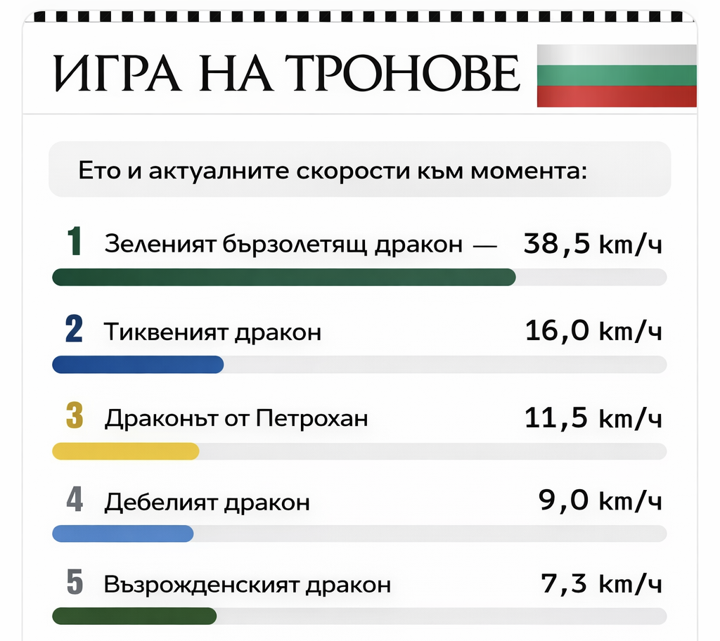 „Игра на тронове“ навлиза в решителна фаза: Зеленият дракон води убедително с 38,5 км/ч