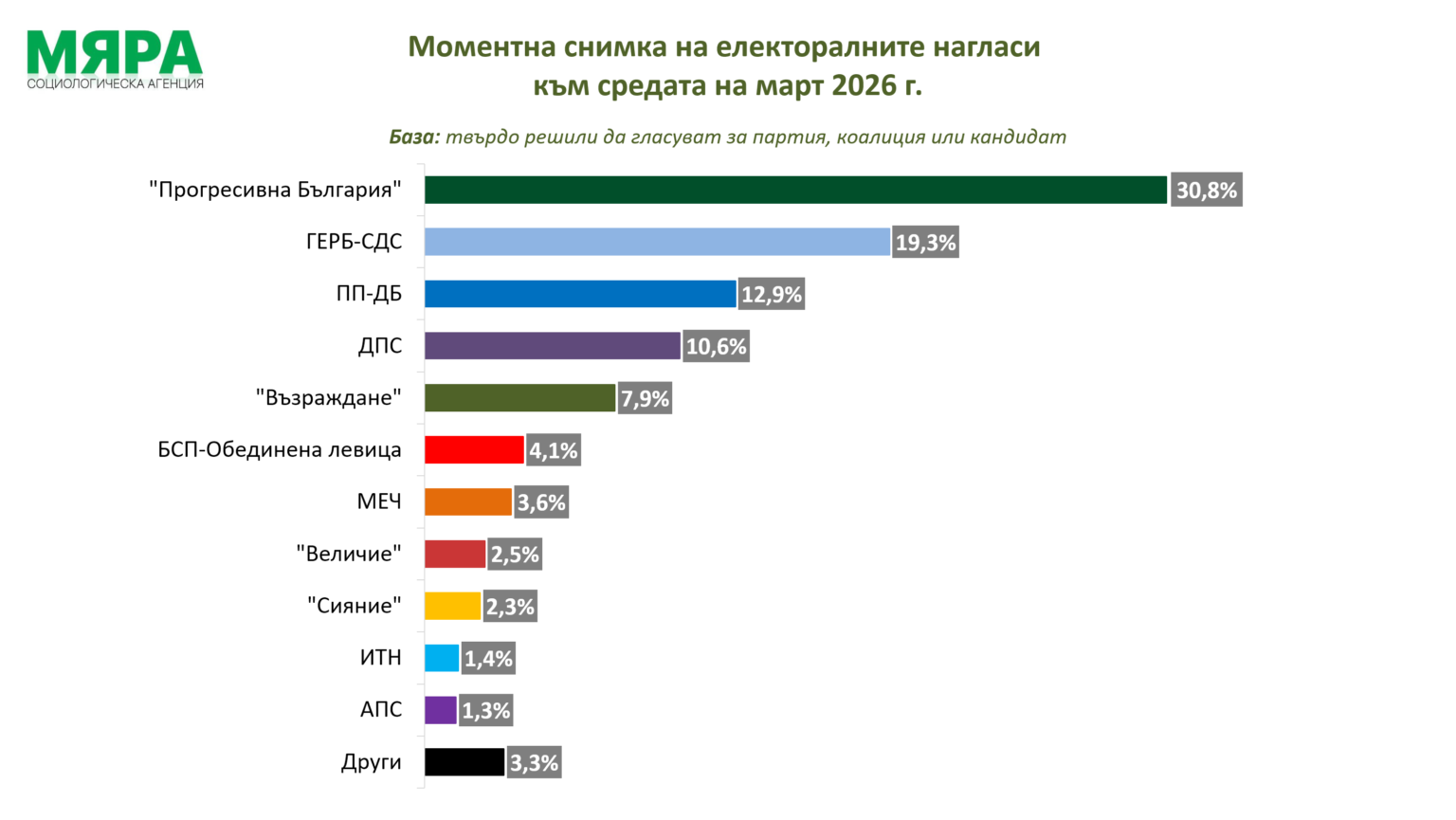 Ако изборите бяха в средата на март, декларативната подкрепа сред заявяващите, че ще гласуват за определена партия и коалиция или кандидат, изглежда по следния начин: формацията на Румен Радев „Прогресивна България“ би спечелила 30,8% от гласовете, ГЕРБ-СДС – 19,3%, ППДБ – 12,9%, ДПС (Ново начало) – 10,6% и „Възраждане“ – 7,9%. Около бариерата би била БСП-Обединена левица с текущ резултат „на ръба“ с 4,1%, недалеч от МЕЧ – с 3,6%. „Величие“ би имало 2,5%, а „Сияние“ влиза отчетливо в битката за ръст – с 2,3%. ИТН би получила 1,4%, а АПС – 1,3%. В битката към процент, от днешна гледна точка, могат да се различат формации като „Синя България“, „Антикорупционен блок“ и т.н.