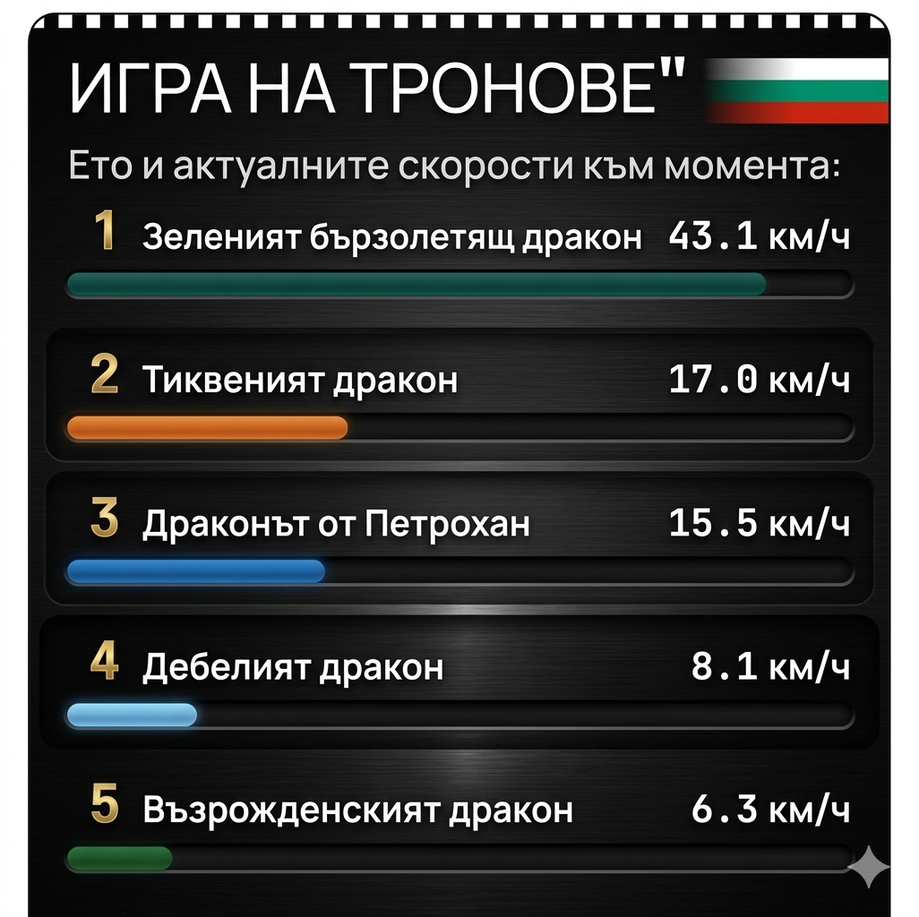 Към този момент Зеленият бързолетящ дракон доминира състезанието с впечатляваща преднина, оставяйки конкуренцията далеч зад гърба си. Веднага след него, на втора позиция се нарежда Тиквеният дракон, който до този момент успяваше да запази устойчиво темпо и да затвърди позицията си на основен претендент за среброто. Доскоро изглеждаше като сигурен подгласник, но в последните минути се наблюдава рязка мобилизация при Дракона от Петрохан. С мощно ускорение той скъсява дистанцията и поставя под сериозна заплаха сребърния медал на своя опонент.