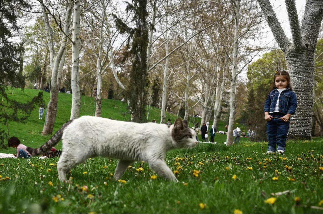 Котка се разхожда до иранско момиче в парк на Деня на природата в Техеран в четвъртък. Маджид Асгарипур/Агенция Wana News/Ройтерс